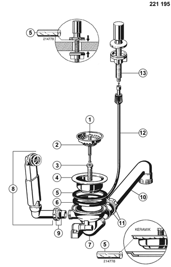 Ablaufgarnitur 1 x 3,5'' Sieb mit Zug Ablauffernbedienung Überlauf rund (ersetzt durch 223293)