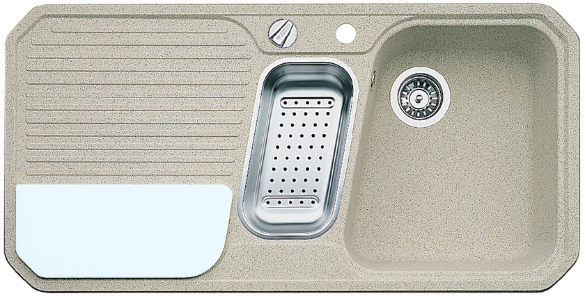 BLANCO PRIMO, SILGRANIT Clean, sand, with drain remote control, with stainless steel colander, Bowl right, 600 mm min. cabinet size